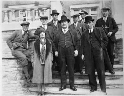 Edgar Wallis on the steps of his home, Chalklands, EW's P.A. Miss Rizer, rt.Dilly Weldon cameraman, Cyril King Chief Sparks, Bill Bigsworth, electrician, Arthur Alcott with Pipe, unknown with watch chain. | |||||||||||||||||||||||||||||||||||||