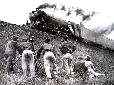 A very early shot of The Three Stooges, Moe Howard, Larry Fine and Curley Howard. c.1933.The Gent in the suite is Ernst Lubitsch, famous director of To Be or Not to Be. (1942) On the track location filming of Night Mail. (1934) Felix Alymer answers a call, and the Lion who bit off more than he can chew has Charlotte Mansfield in his mouth |