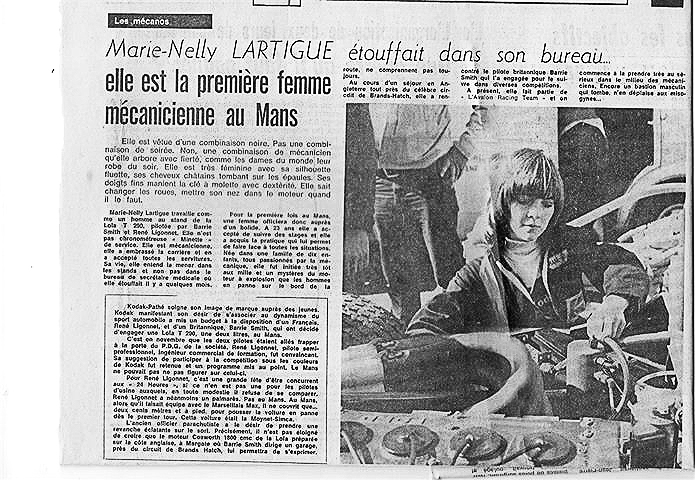 She knows how to change wheels and check the engine when necessary. Marie-Nelly works like a man in the pits of the Lola T290 driven by Barrie Smith and René Ligonnet. She is not a dolly bird time keeper. She is a mechanic who has taken full responsibility of her job. She expects to spend her life in the pits, not in the office as a medical secretary which she found so stuffy only a few months ago !